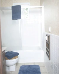 First step was to replace the old window. A much more energy-efficient, solid vinyl window was chosen. The new, smaller, side-sliding window was also located higher to avoid water damage from the shower.